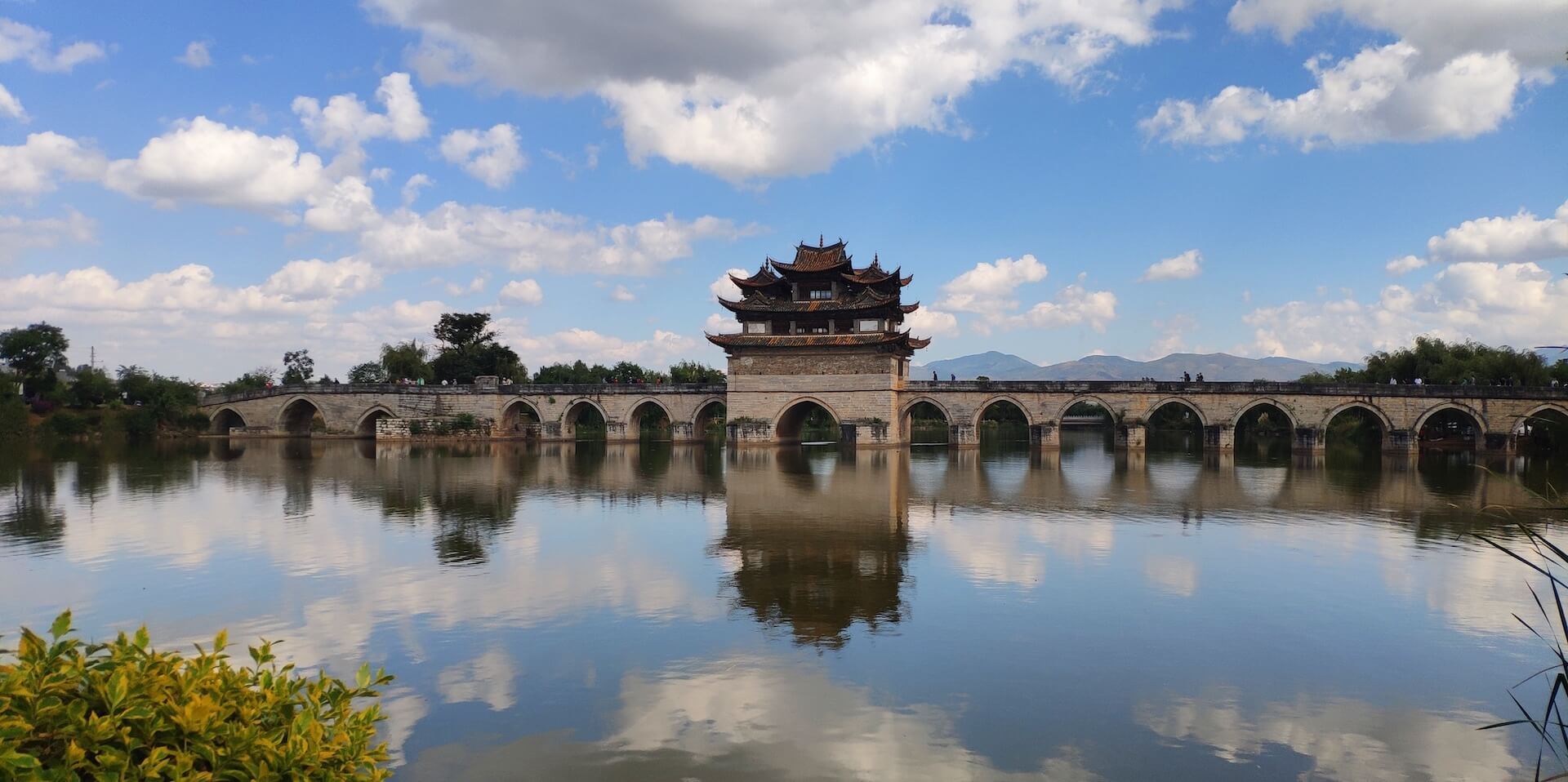 Situé sur le trajet Jianshui-Tuanshan (à 5km de Jianshui), ce très bel ouvrage mesurant 148 mètres de long est également appelé « pont aux 17 arches ». Il enjambe à leur confluence les rivières Tachgong Jiang et Lu Jiang qui ondulent tels deux dragons dans une paisible verdure. Les trois premières arches datent du règne de Qianlong (1736-1796), les autres du début du XIXème siècle. Le pont du double dragon est considéré comme l’un des plus beaux et des mieux conservés de Chine.