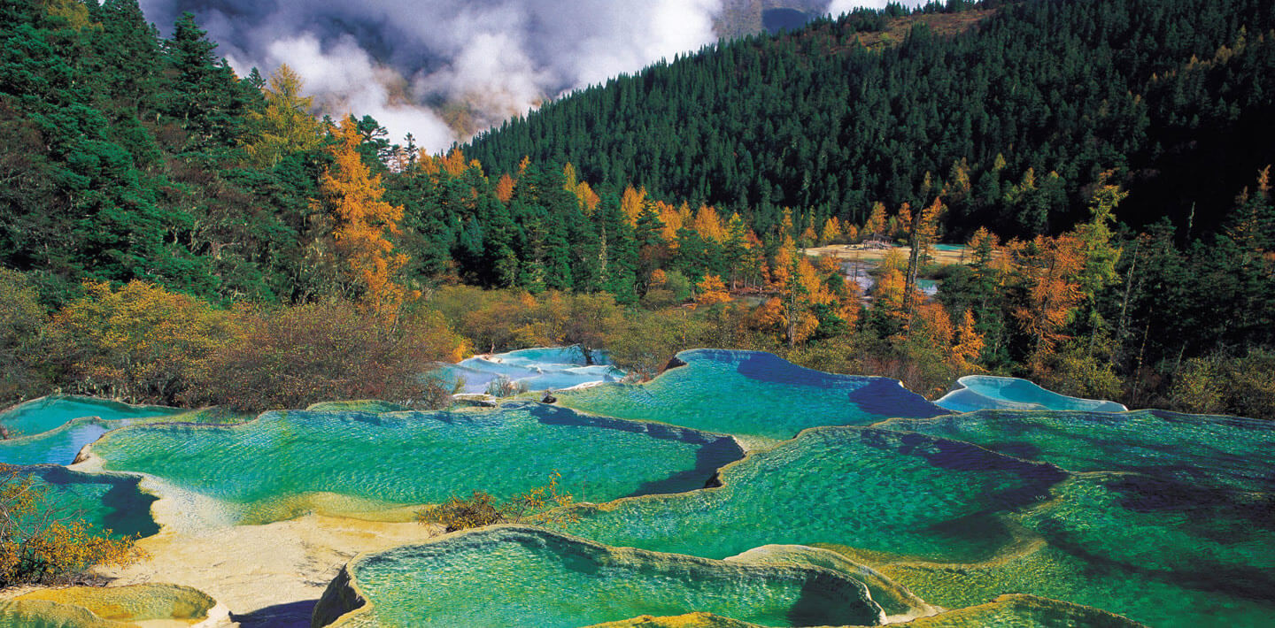 Signifiant « La vallée du Dragon Jaune », Huanglong est bien connu pour ses fabuleux lacs de travertin côtoyant des cascades, les montagnes enneigées, vallées et forêt vierge. Il a été classé au patrimoine mondial de l’UNESCO en 1992.